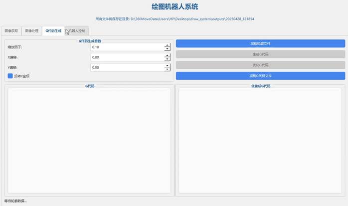 该系统设定界面专为基于OpenCV的绘图机器人设计,用户可在此设置缩放因子和偏移值,以生成优化后的G代码。通过调整缩放因子,用户能够控制绘图的尺寸大小,而偏移值的设定则用于精确调整绘图的起始位置。生成的G代码经过优化,仅保留X和Y坐标,确保绘图机器人能够准确地在平面上进行绘图。此界面简化了绘图流程,提高了绘图效率和精度,满足了用户对绘图机器人的多样化需求。如下图所示: