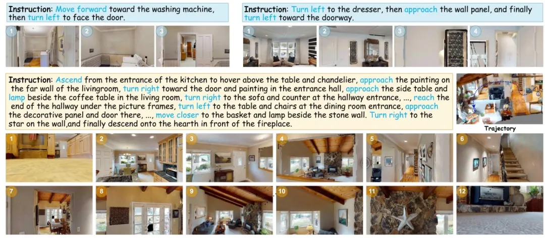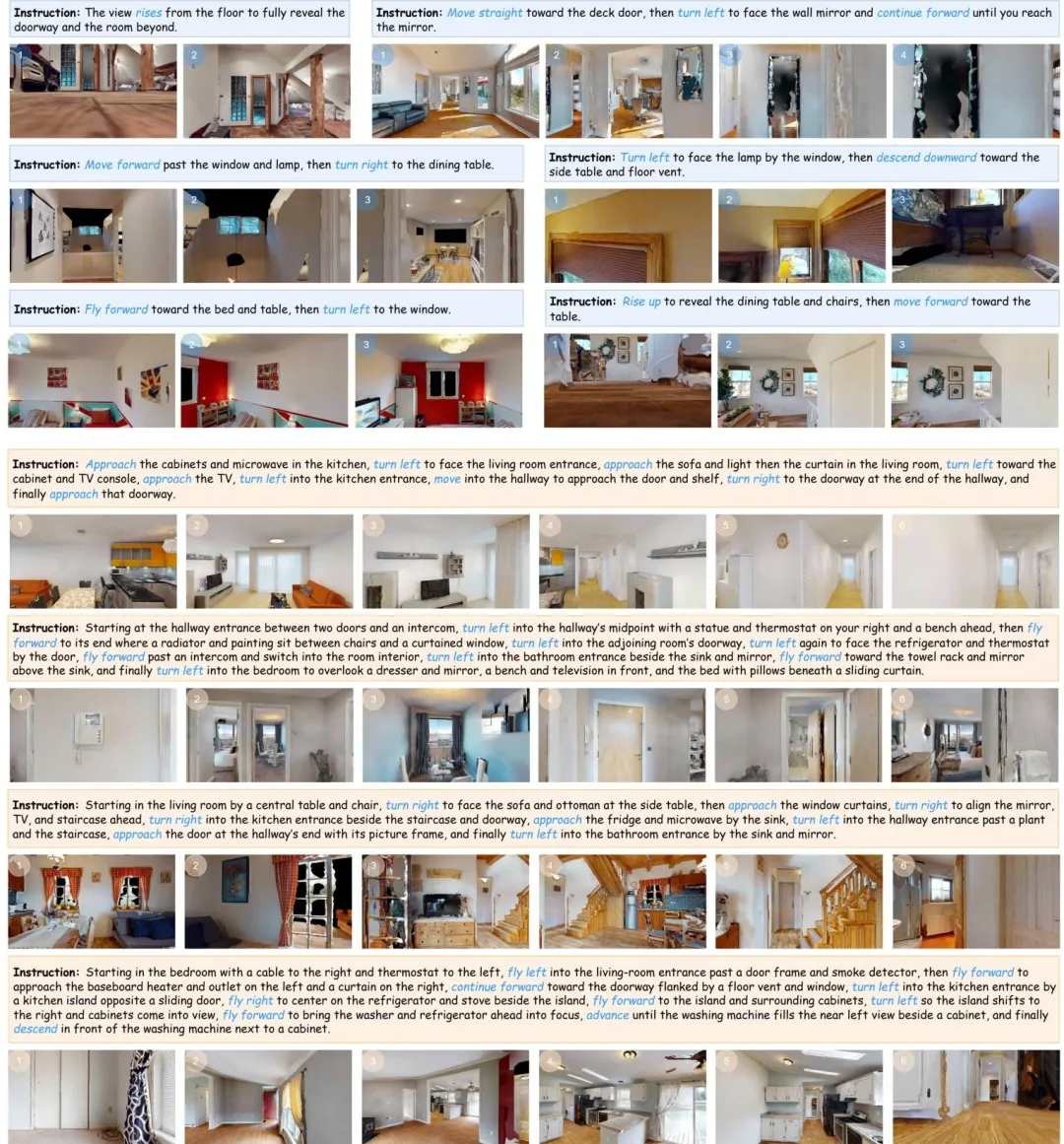 图3| 长视距导航实例。复杂的跨房间导航被拆解为从卧室起飞、穿过客厅、进入厨房等连续的短程动作,模型通过子任务的串联成功完成了长距离飞行。