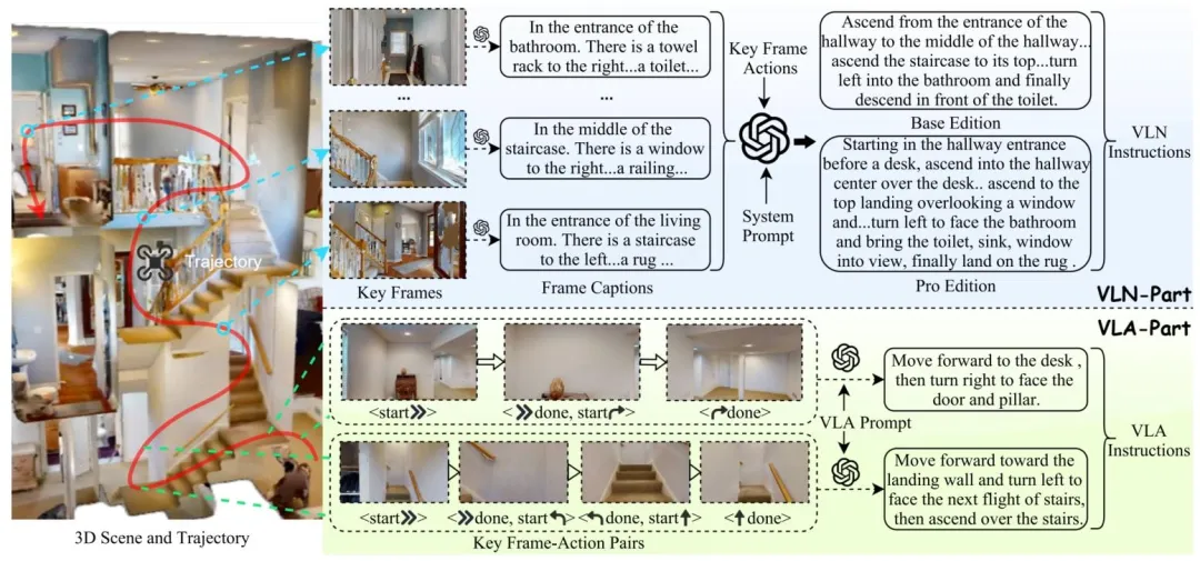 图1| IndoorUAV-VLN(上)与 IndoorUAV-VLA(下)数据集示意图。上图展示了包含复杂任务与长轨迹的长视距 VLN 任务;下图展示了仅包含 1-3 个动作、专注于精细操控的短视距 VLA 任务。