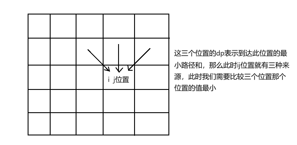 和上面一样,我们按照一个位置来看,就是到达i,j位置的最小下降路径和;那么我们可以推测出这里的状态转移方程
