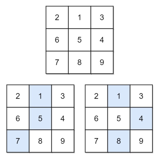 给你一个 n x n 的 方形 整数数组 matrix ,请你找出并返回通过 matrix 的下降路径 的 最小和 。下降路径 可以从第一行中的任何元素开始,并从每一行中选择一个元素。在下一行选择的元素和当前行所选元素最多相隔一列(即位于正下方或者沿对角线向左或者向右的第一个元素)。具体来说,位置 (row, col) 的下一个元素应当是 (row + 1, col - 1)、(row + 1, col) 或者 (row + 1, col + 1) 。