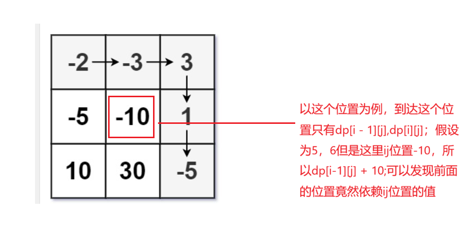 以这个位置为例,到达这个位置只有dp[i - 1][j],dp[i][j];假设为5,6但是这里ij位置-10,所以dp[i-1][j] + 10;可以发现前面的位置竟然依赖ij位置的值;依次类推,我们是不是还要依赖更加靠后的位置,所以这种状态表示根本不是正确的;