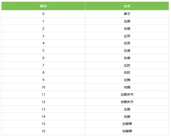 // 0鼻子, 1左眼, 2右眼,3左耳,4右耳,5左肩,6右肩,7左肘,8右肘,9左腕,10右腕,11左髋关节,12右髋关节,13左膝,14右膝,15左脚踝,16右脚踝