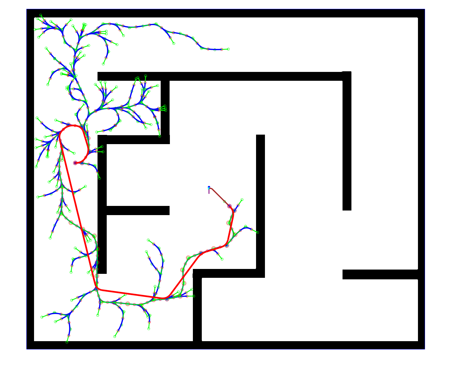 RRT 算法无需对环境进行复杂建模,能快速探索高维空间,适用于复杂环境下的路径规划,在机器人运动规划、机械臂控制等领域广泛应用。但原生 RRT 算法生成的路径存在明显缺陷,由于是通过节点间直线连接形成路径,存在大量冗余节点与尖锐拐点,路径不光滑,曲率变化不连续,无法直接应用于非完整性机器人,需进一步优化处理 。
