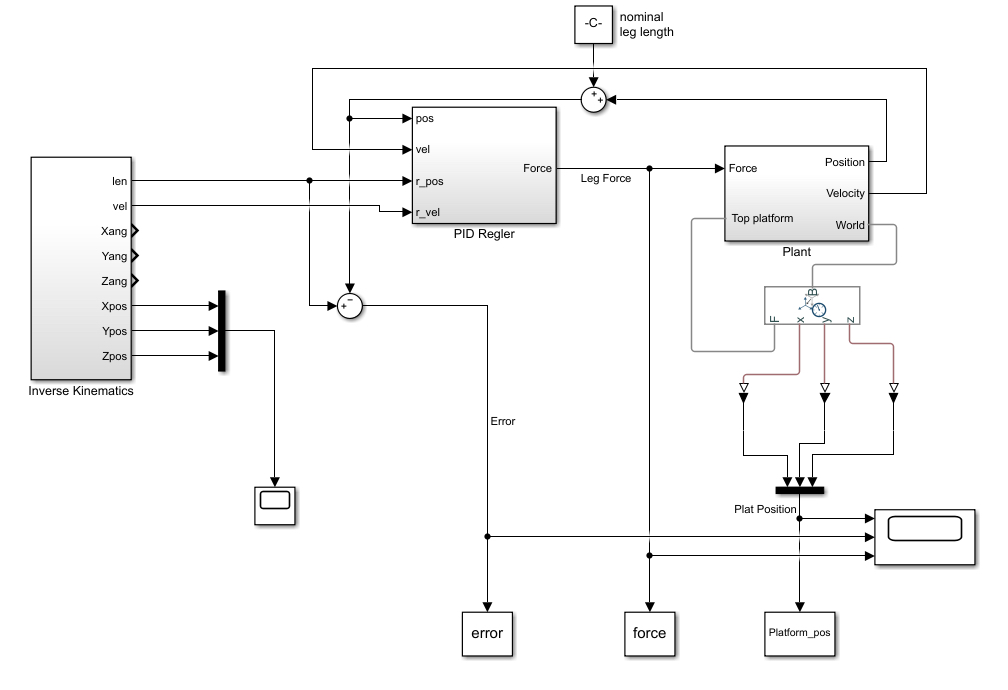 这样,一个基于Simscape的Stewart平台物理模型就初步搭建好了,结合前面设置好的PID控制器,就能进行完整的运动控制仿真了。