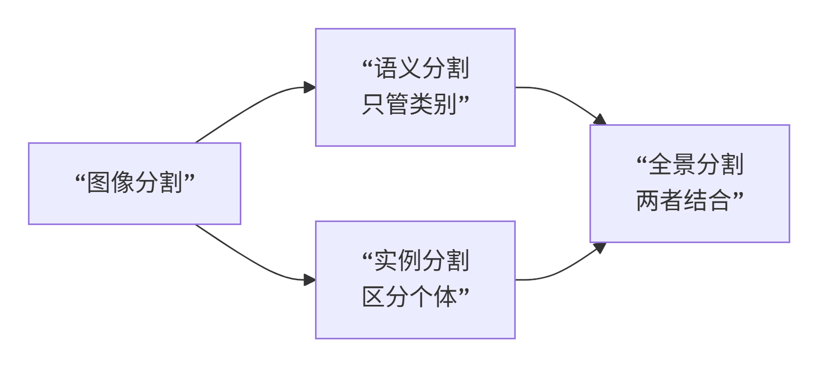 特点:对可数的物体(如人、车、猫)做实例分割,对不可数/背景类(如天空、道路、草地)做语义分割。