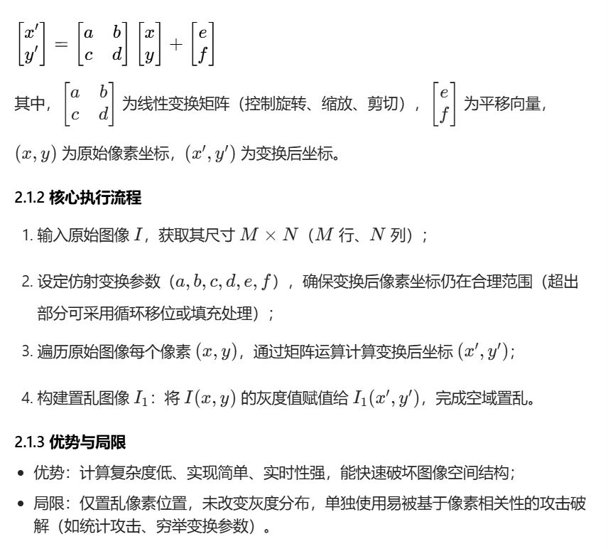 仿射变换是一种线性几何变换(含平移、旋转、缩放、剪切)与平移变换的组合,核心是通过矩阵运算改变图像像素的坐标位置,实现像素 “置乱”—— 不改变像素本身的灰度值,仅破坏像素间的空间关联,让攻击者无法从乱序像素中提取有效信息。其数学表达式为: