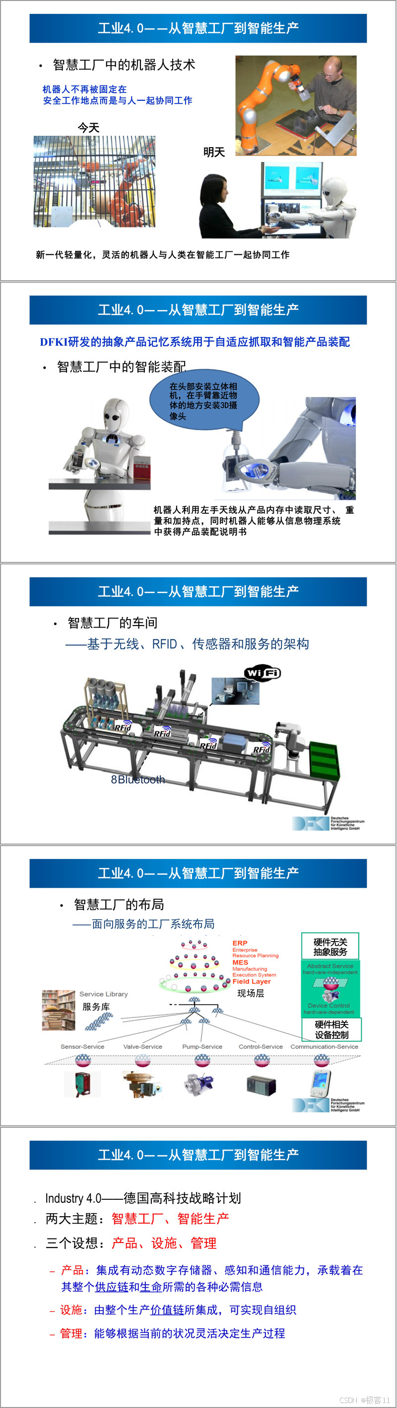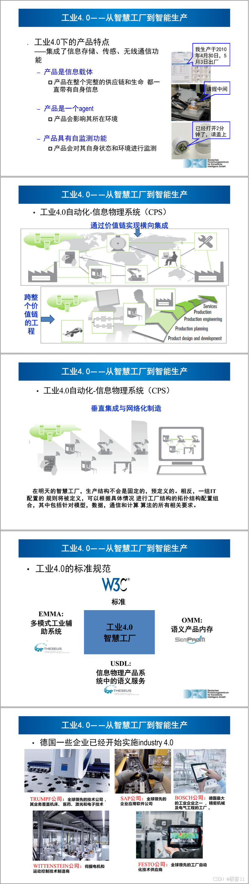 文件对德国“工业4.0”战略进行了重点解析。该战略以“智能工厂”和“智能生产”为核心主题,得到德国政府及学术界、产业界的大力支持与资金投入。智能工厂聚焦于智能化生产系统与网络化分布式设施;智能生产则涵盖生产物流管理、人机交互及3D打印等技术的应用。其核心设想围绕产品、设施与管理三大维度展开:产品成为集信息存储、传感与通信功能于一体的智能信息载体;生产设施实现自组织;管理系统能根据实时状况灵活调整生产流程。信息物理系统是实现横向与纵向集成的关键技术基础。