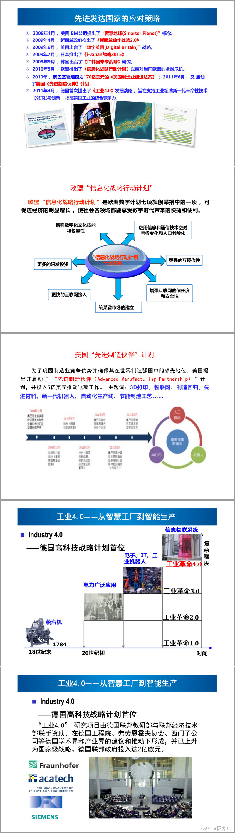 在全球战略层面,文件梳理了各国自2009年起推出的重要战略举措:美国提出“智慧地球”并推动《制造业促进法案》与“先进制造伙伴计划”;德国于2011年率先提出“工业4.0”战略,旨在通过信息物理系统等手段提升工业竞争力;此外,新西兰、英国、日本、韩国及欧盟也相继推出了各自的数字化战略。这些动向表明,全球主要工业国家均在积极抢占新一轮工业革命的技术与产业制高点。