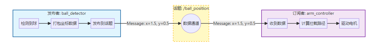 # 核心代码片段 class BallDetector(Node): def __init__(self): super().__init__('ball_detector') # 创建发布者:话题名为 '/ball_position' self.publisher = self.create_publisher(String, '/ball_position', 10) self.timer = self.create_timer(0.5, self.timer_callback) def timer_callback(self): # 模拟生成坐标 msg = String() msg.data = f'x={random.uniform(0,3):.2f}, ...' self.publisher.publish(msg) self.get_logger().info(f'发布: {msg.data}')4. 编写“订阅者” (arm_controller.py)