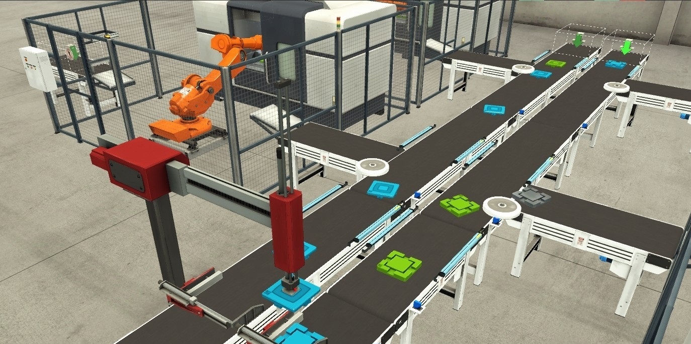 这个程序主要应用在这样一个场景中:四台加工中心(这里的机器人可不是真家伙,只是仿真软件FactoryIO里的一个部件罢了)开启工作模式。它们加工好的零件呢,会通过皮带输送到机械手那儿进行组装。这里的机械手逻辑效率超高,同时皮带还具备防堵、避让、分流等一系列厉害的功能。