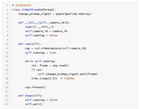 系统使用多线程处理视频流,确保界面响应性,核心代码展示如下: