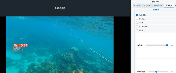 在图像增强界面,用户可以选择多种图像增强技术来提升水下图像的质量和目标特征的可见性。这些技术包括CLAHE增强、伽马矫正、白平衡调整、水下图像去雾和无增强选项。用户还可以根据需要调整伽马值和CLAHE强度,以获得最佳的图像效果。这些功能的实现依赖于后端服务器上预定义的图像处理算法和参数设置,以及前端界面的滑块和下拉菜单等交互元素,使用户能够灵活地定制图像增强策略,从而提高后续目标识别任务的准确性和可靠性。图像增强界面具体如图所示: