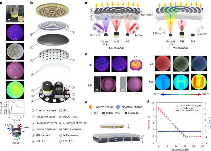 SuperTac 的核心竞争力在于其厚度仅为 1 mm 的光场调制多层感知皮肤。皮肤最外层的导电层采用透明的 PEDOT:PSS,通过丝网印刷技术在具有优异拉伸性能的 TPU 薄膜上形成涡旋线电极设计。这种涡旋设计能提供均匀的电学信号,结合摩擦起电机制,使皮肤在接触不同电负性物体时产生截然不同的电学反馈,从而实现高精度的材质分类与 15 cm 范围内的接近觉探测。