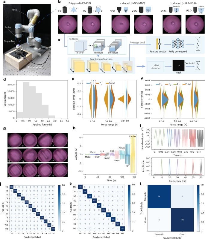 鸽子能通过视网膜中的隐花色素等分子感知地磁场,这是一种不依赖图像的物理感知。SuperTac 在 1 mm 厚的皮肤内嵌入了摩擦纳米发电机(TENG)和惯性测量单元(IMU)。