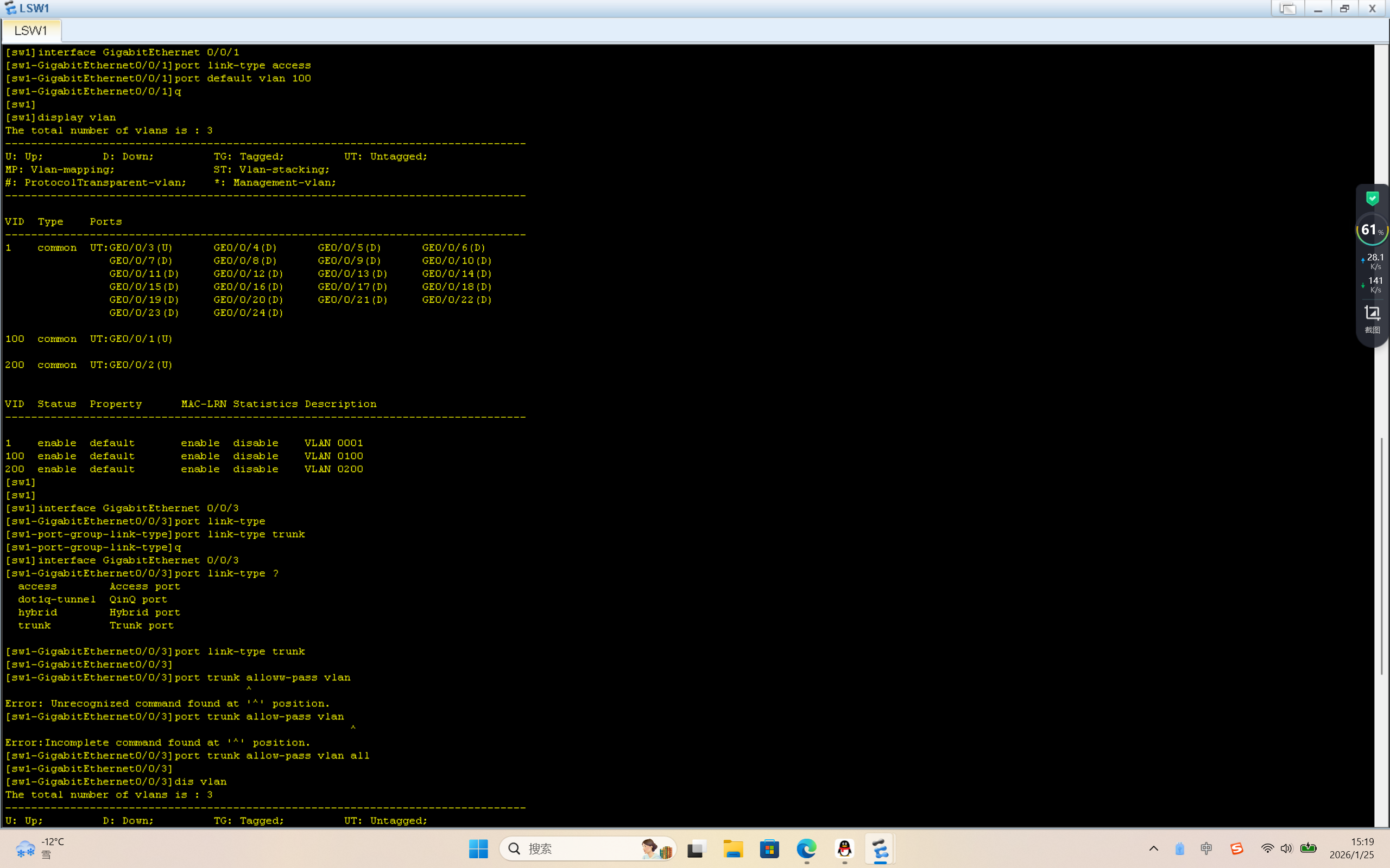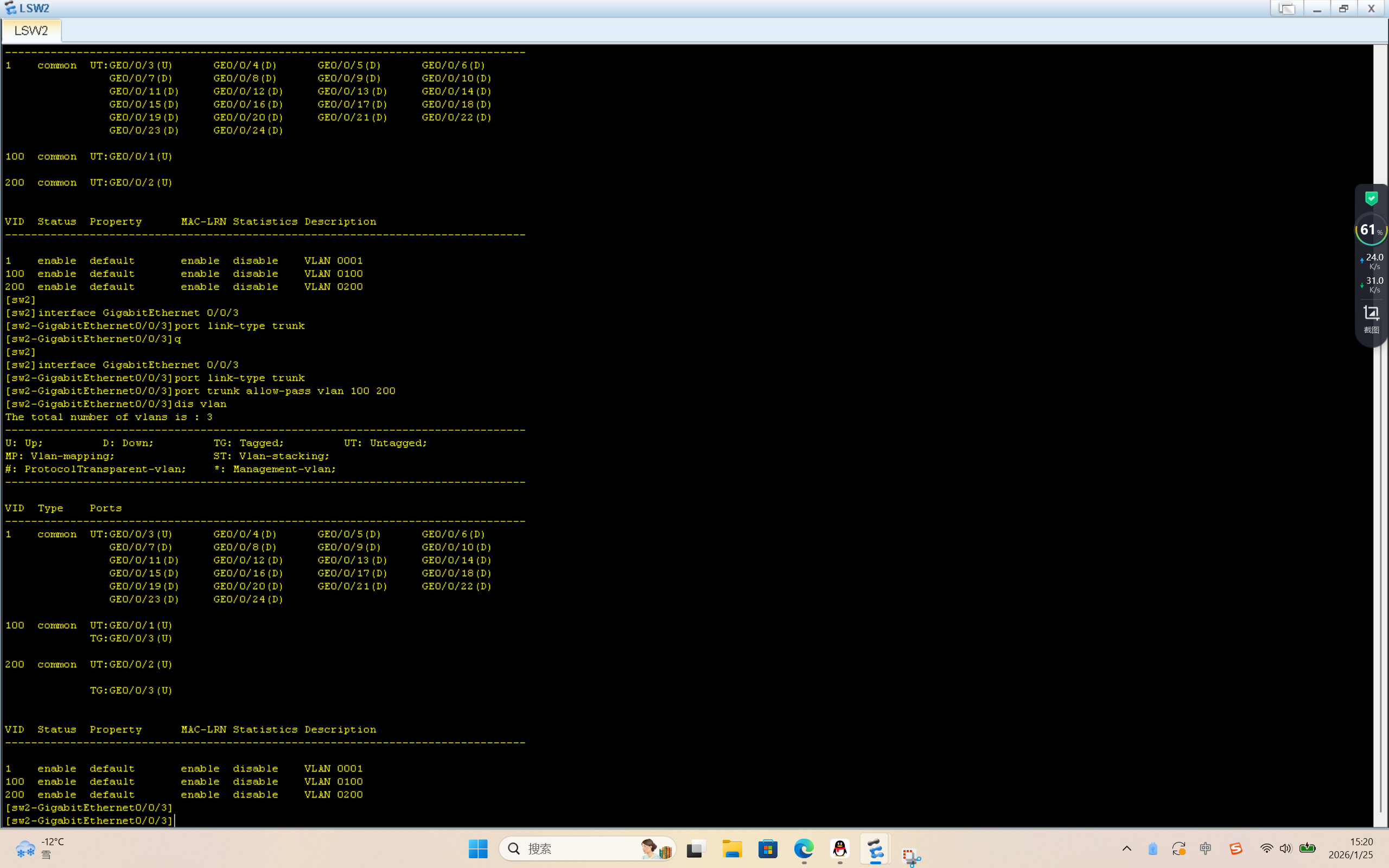 ◦ VLAN 100/200用户均可访问ISP网络(如 ping 202.100.2.1)。
