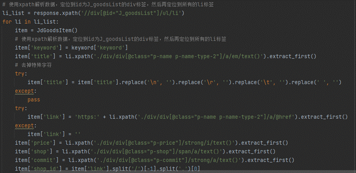 系统利用爬虫Scrapy爬取京东网站当中的商品信息,为下一步数据挖掘做准备其核心代码如图5-8所示。
