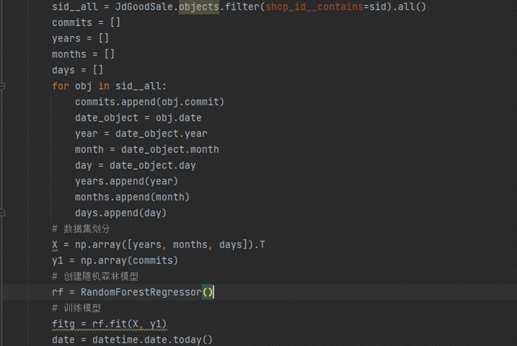 系统利用机器学习当中的随机森林算法依照数据库当中的历史数据,预测未来15天的销量与价格,其核心代码如图5-9所示。