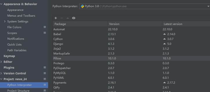 系统后台使用python书写,采用django框架搭建。以下是需要配置的一些插件,包括pyMysql,django,pip等,系统的虚拟环境采用python3.8,具体如下图所示。
