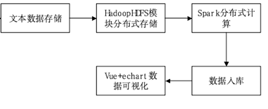 系统开发流程如下图所示,首先需要使用request爬虫框架网中获取到相应的网页,并且通过BeautifulSoup提取需要的相关数据,然后通过pandas写入到csv文本文件中,然后再通过操作hadoop进行分布式存储,通过Spark分布式计算写入到数据库中,最后通过前台的vue和Echart进行数据可视化展示。