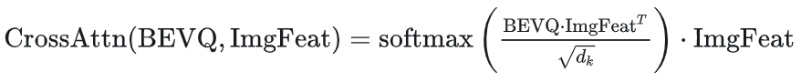 - 注意力计算:计算BEV查询与图像特征的注意力权重