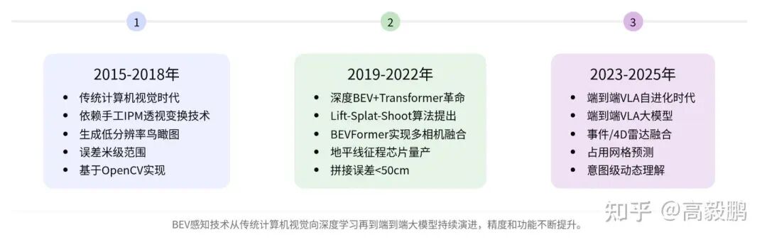 然而,BEV感知技术的发展并非一蹴而就。从2015年的手工IPM透视变换到2025年的端到端VLA模型,BEV感知经历了从”几何变换”到”端到端学习”的完整演进过程。在这一过程中,传感器标定和****时间同步作为底层工程基础,始终是BEV感知技术发展的关键瓶颈和突破点。