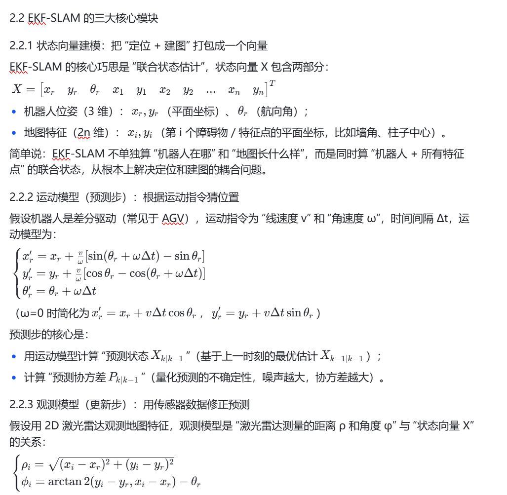 扩展卡尔曼滤波(EKF)是解决 SLAM 问题的经典框架,核心逻辑是 “联合估计机器人位姿和地图特征”,把定位和建图融合成一个优化问题,优势显著: