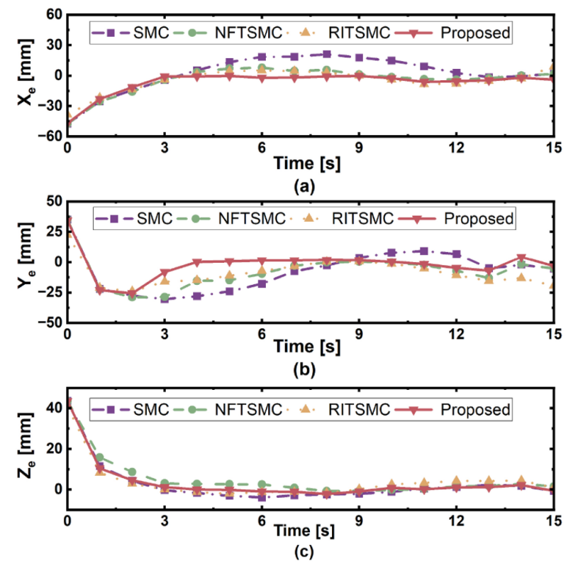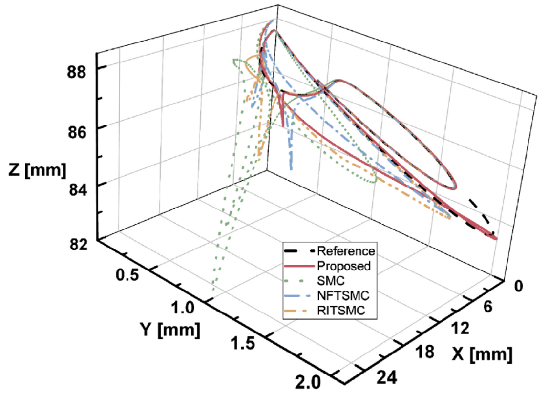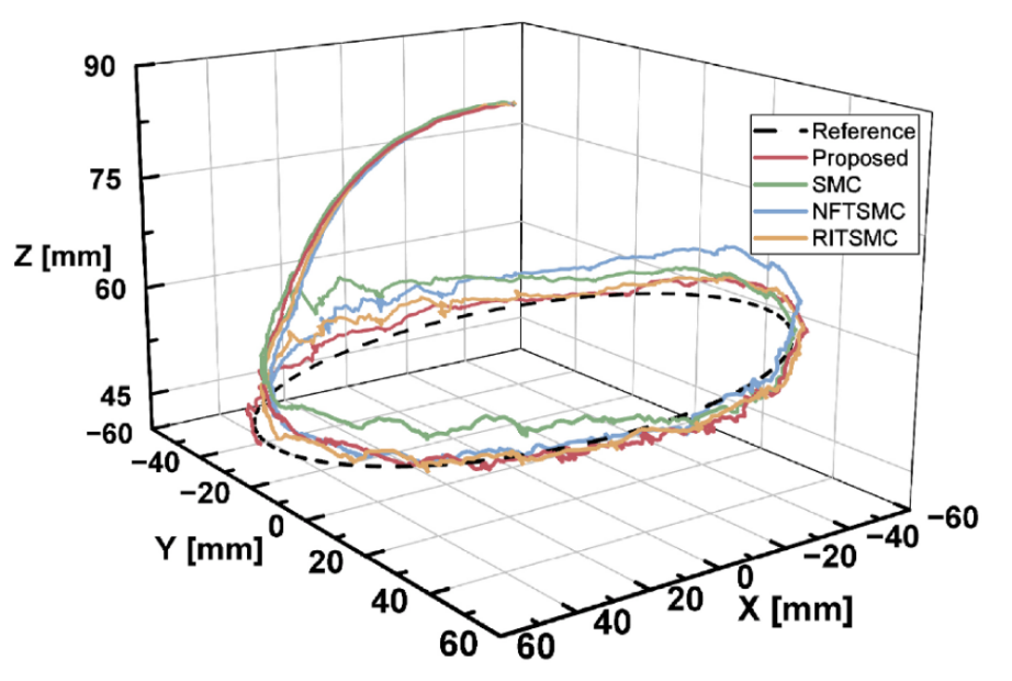 实验结果表明,相较于传统滑模控制(SMC)、非奇异快速终端SMC(NFTSMC)和鲁棒积分终端SMC(RITSMC),本文控制器以最小的轨迹误差实现了优越的跟踪精度。在X/Y/Z三轴方向上,本方案最大跟踪误差峰值分别为3.915mm、4.261mm、2.103mm,较最优的对比控制方法分别降低30.3%、78.2%、51.7%。