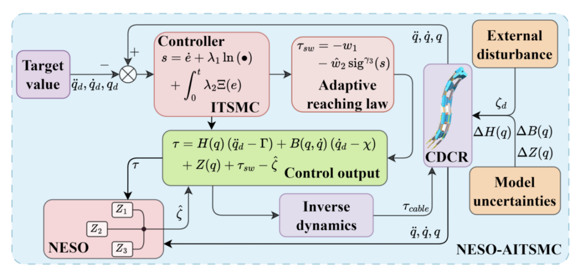 论文提出一种融合非线性扩展状态观测器(NESO)的自适应积分终端滑模控制方法(NESO-AITSMC),用于提升绳驱动连续体机器人在扰动环境下的轨迹跟踪精度。