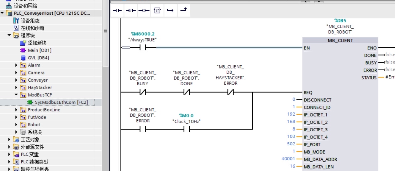 面对多个Modbus TCP主站需求,项目里直接祭出西门子的ModbusCommLoad和Modbus_Master指令块。这里有个坑要注意——每个主站需要独立背景数据块,不然数据会串台: