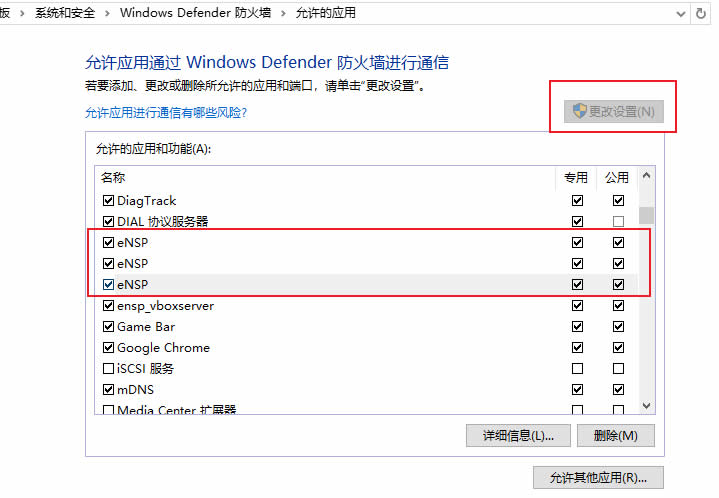 6.6:打开电脑设置,更新和安全,Windows安全中心,防火墙和网络保护,允许应用通过防火墙,点击更改设置,将ensp后方选项全部打勾即可。