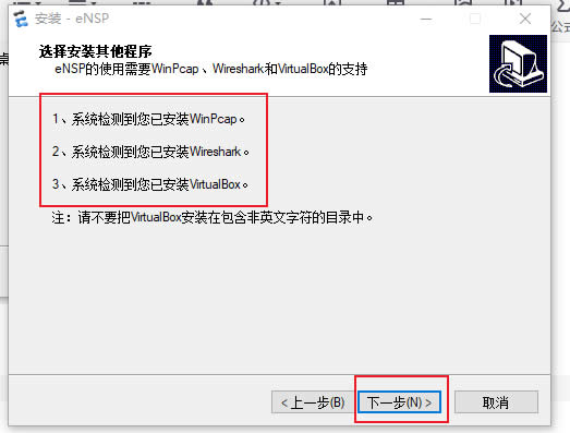 此时,前面三个依赖程序已经全部安装完成,下面安装主程序eNSP