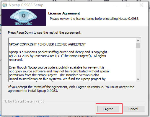 4.8:安装过程中会弹出安装Npcap,此时Wireshark是等待状态,继续安装,点击 I Agree.