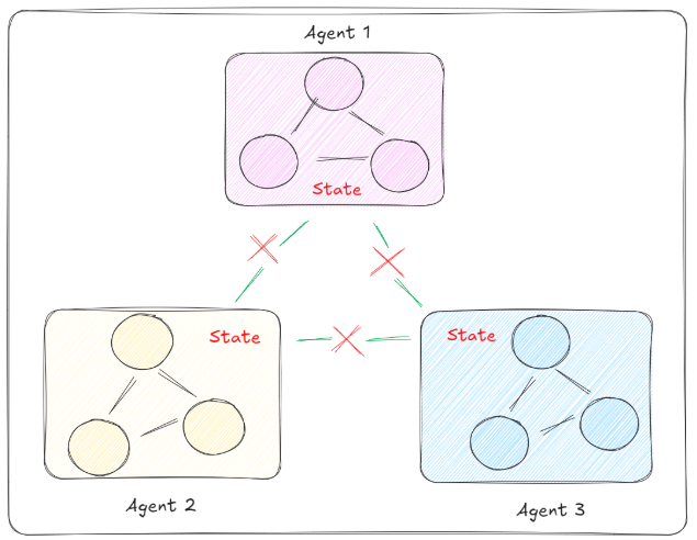 Agent间自由通信,类似网状拓扑。每个Agent都可以直接与其他Agent通信。