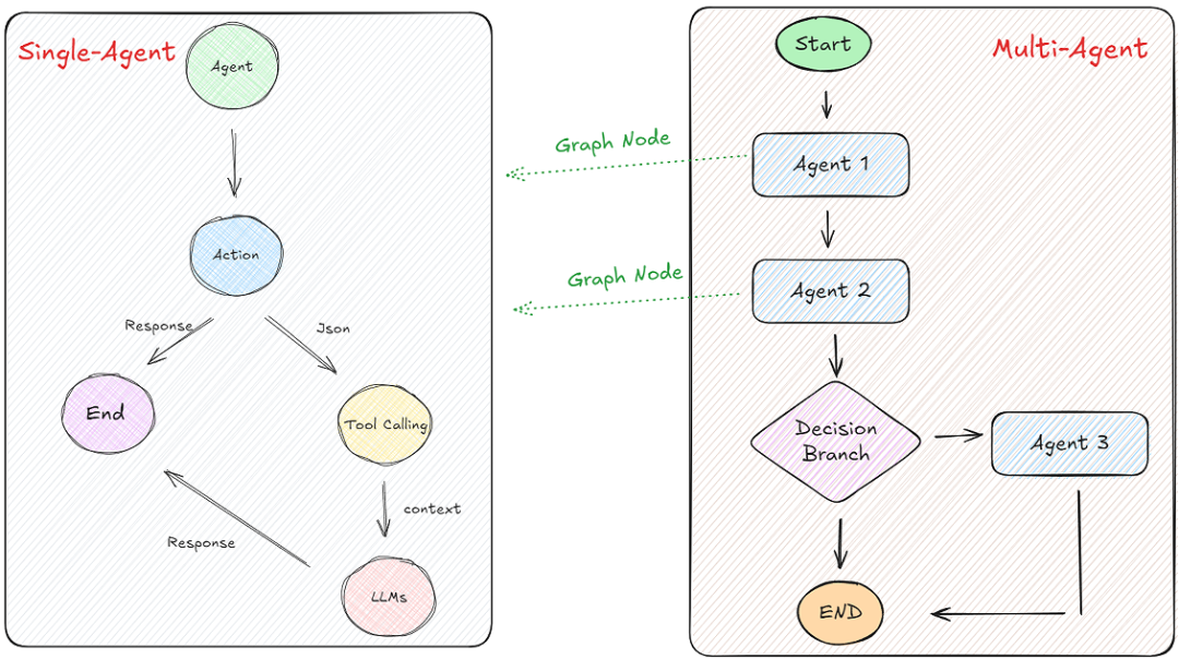 单Agent像一个人扛活儿,多Agent则是团队协作。代码上对比下: