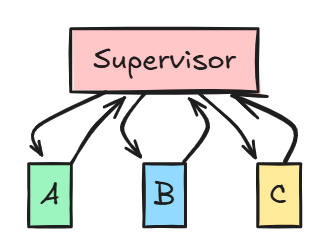 所有Agent都通过一个中心Supervisor进行通信,Agent之间不直接通信。