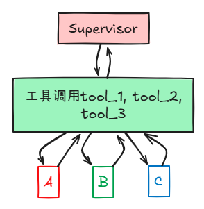 Supervisor通过工具调用来调度Agent,工具作为中间层。
