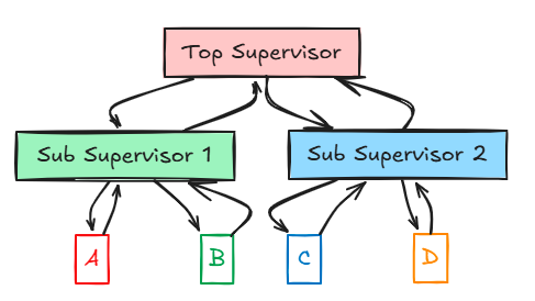分层管理结构,顶层Supervisor管理子Supervisor,子Supervisor再管理Agent。