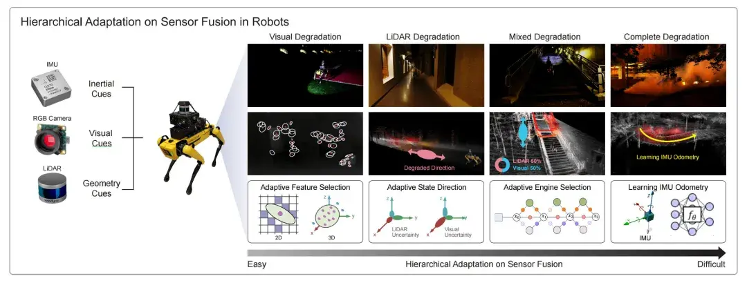 图3|机器人传感器融合中的“分层自适应”示意。系统会根据环境退化程度逐级升级感知与估计策略:在视觉退化阶段,首先启用自适应特征选择,优先过滤不可靠的视觉观测;当 LiDAR 退化或几何约束不足 时,进一步激活自适应状态方向选择,识别并补强最脆弱的位姿方向;在视觉与几 何同时退化的混合场景中,通过自适应因子(引擎)选择,动态决定哪些传感器因子应参与优化;而在完全退化条件下,则由学习式 IMU 里程计接管,作为兜底持续提供位姿估计。