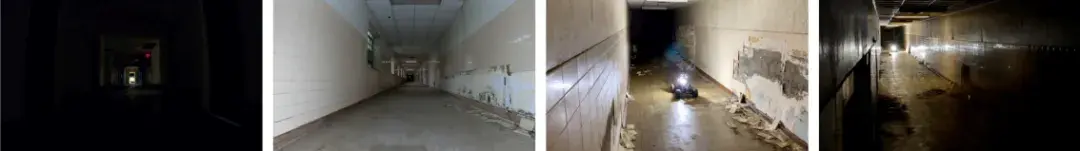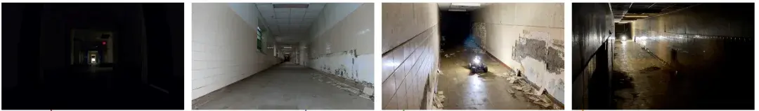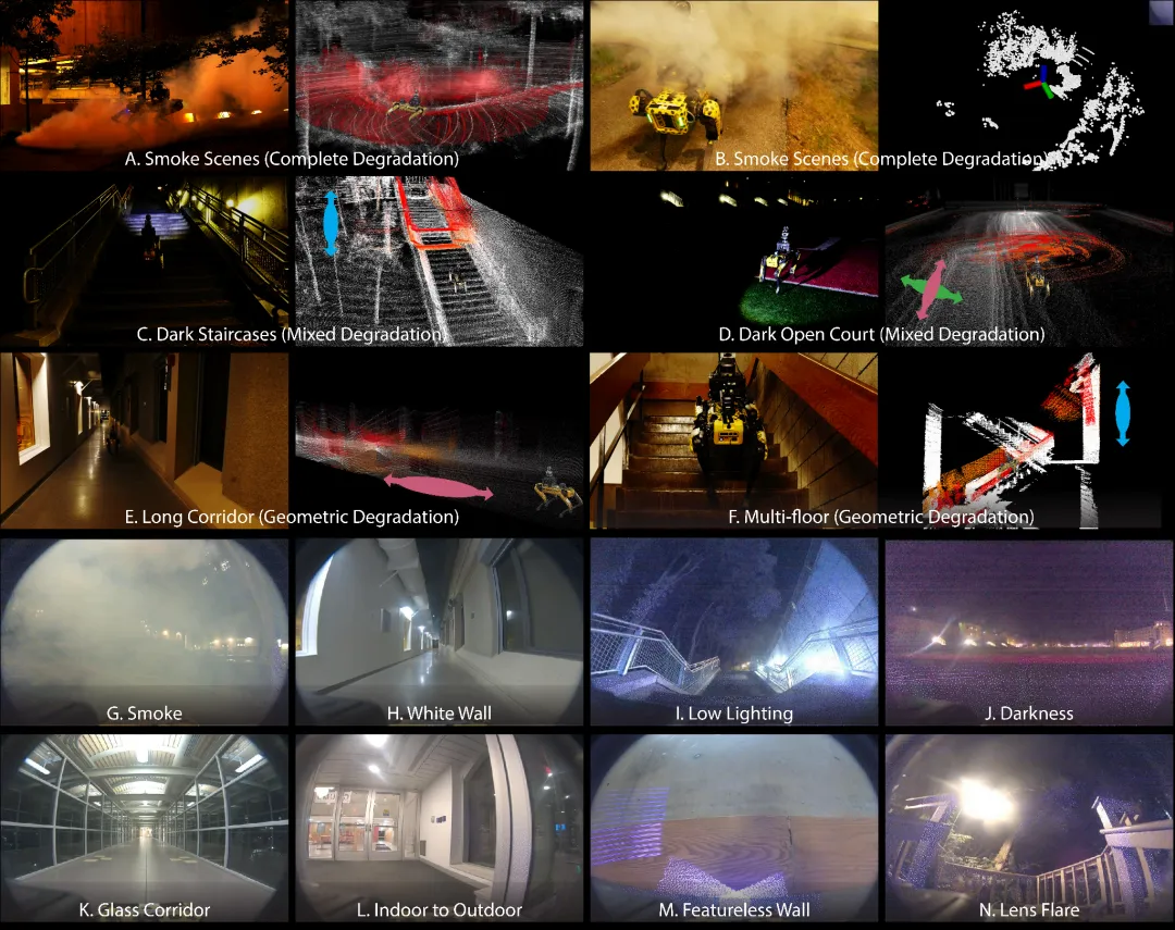 视觉退化(低光、模糊、遮挡等)、几何退化(长走廊或空旷区域导致约束不足)、混合退化(视觉与几何线索间歇性同时变差),以及最极端的 完全退化(例如浓烟环境中,视觉与 LiDAR 同时失效, 见图 1)。