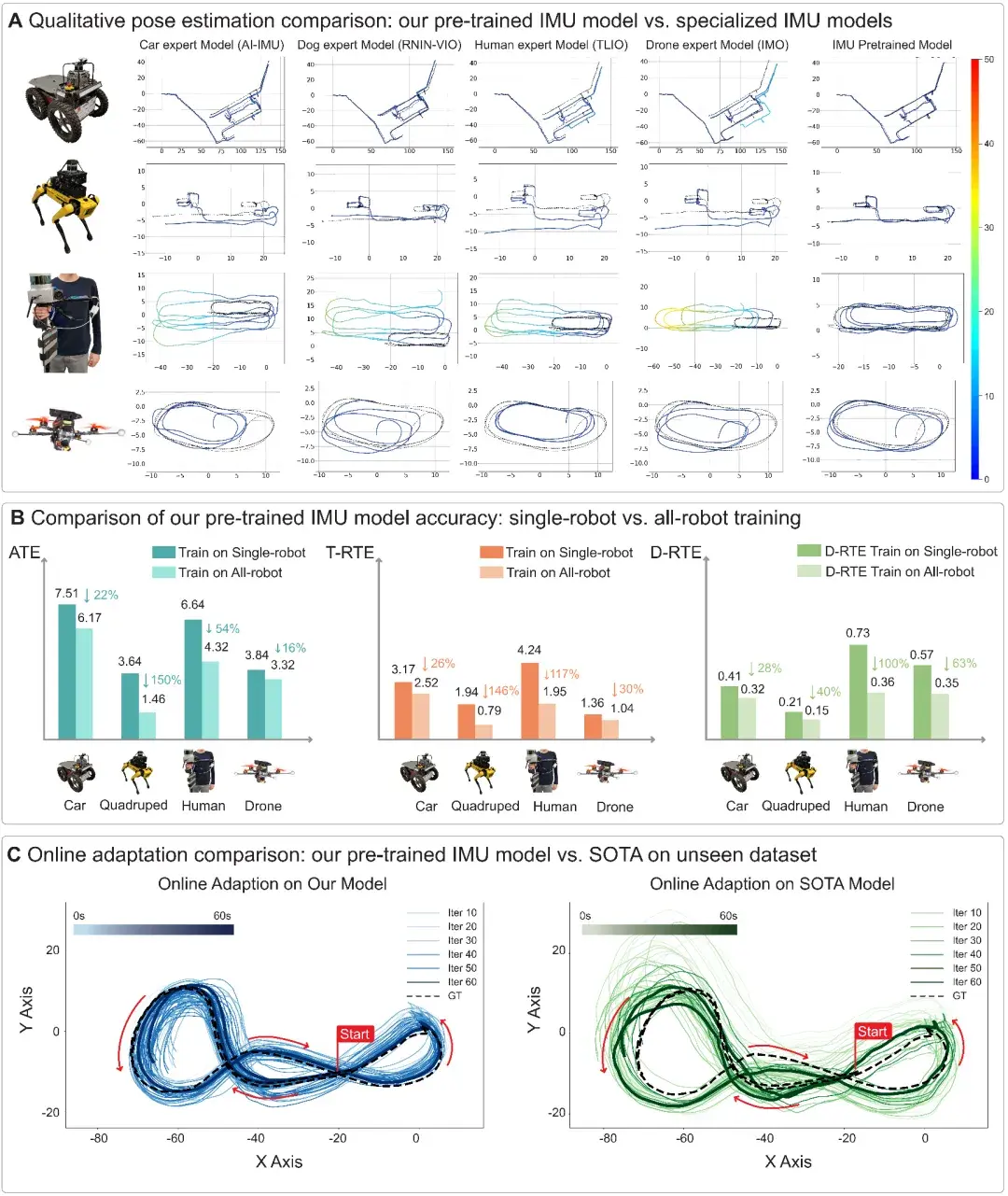 图6|学习式惯性里程计(IMU odometry)的评估结果。定性对比显示,作者的方法在轨迹上最接近真实位姿;同时实验表明,使用多机器人数据进行预训练,比只用单一机器人数据更能显著提升精度;在未见过的新数据集上进行在线自适应时,该方法也能持续优于已有方法