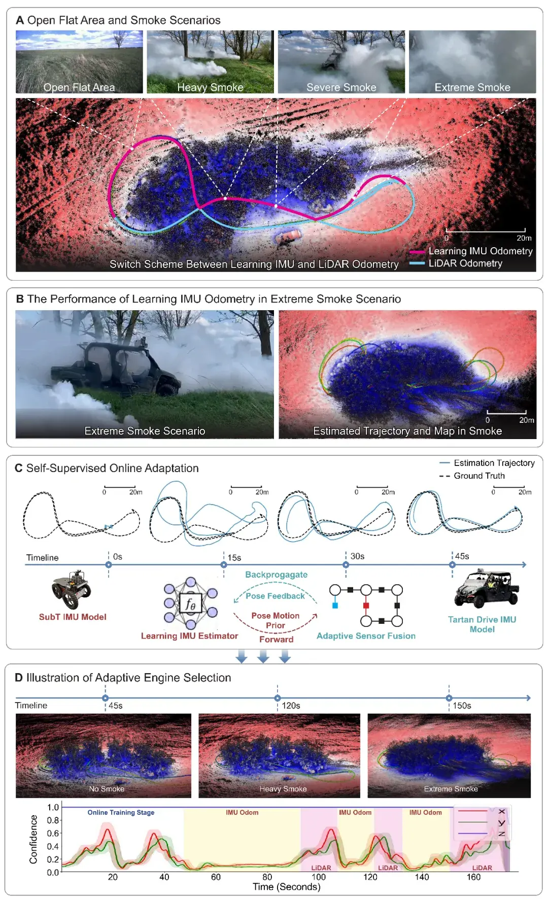 图9|图中展示了系统在极端环境中,如何在学习式 IMU 里程计与 LiDAR 里程计之间进行自适应引擎选择:在重度烟雾导致外感知显著退化时,系统能够依靠学习式 IMU 里程计持续生成稳定的轨迹与地图。同时,系统引入自监督在线适配机制,使 IMU 模型可从一个平台快速迁移到另一个平台;并采用基于置信度的软融合策略,将 IMU 与 LiDAR 的输出进行平滑组合,从而避免生硬的“硬切换”带来的不连续与不稳定。