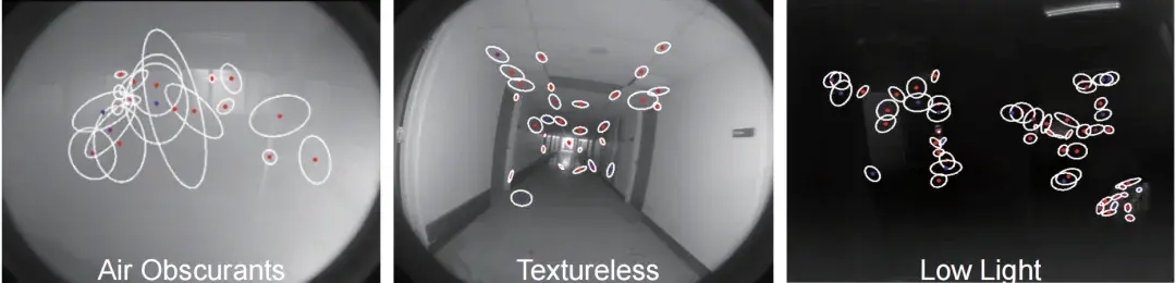 图8|视觉退化条件下的鲁棒特征选择示意。在低光、低纹理与遮挡等恶劣视觉条件下,图中以椭圆表示二维特征点的定位不确定性:椭圆越大,说明该特征越不可靠;椭圆的朝向则刻画了特征在某一二维方向上更易产生跟踪歧义。通过显式估计并利用这些不确定性信息,系统能够优先保留更可信的特征观测,从而在视觉退化时提升前端跟踪的稳定性与鲁棒性。