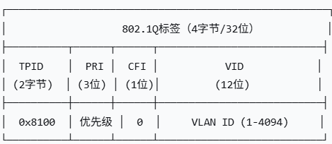 - VID(VLAN Identifier, VLAN标识符),标识帧属于哪个VLAN;12bit,范围:0-4095 (12个1),可用VLAN ID:1-4094(0:-优先级标签-无VLAN信息,仅用于QoS; 1-默认VLAN;4095(0xFFF)-保留)
