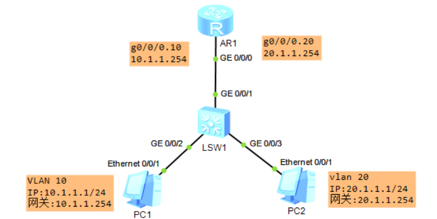 - PC1发的流量实际上还是通过路由的g0/0/0这个物理接口接收,但是逻辑上分配给了g0/0/0.10这个子接口。