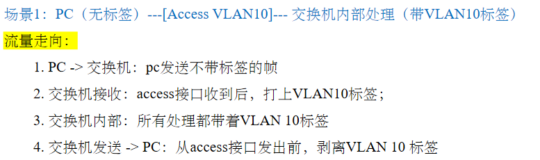 - access 发送流量,带标签,只能发送一个VLAN的流量;trunk 发送流量,只要在VLAN允许列表,携带标签发送,可以发送多个VLAN流量
