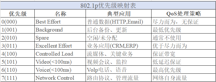 - PRI(Priority 优先级),3bit,范围:0-7(8个优先级)。用于QoS.