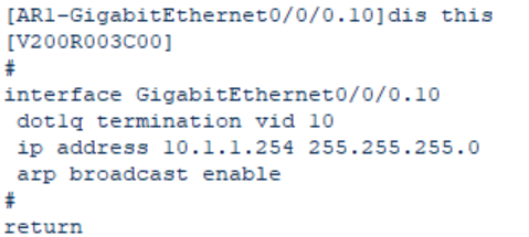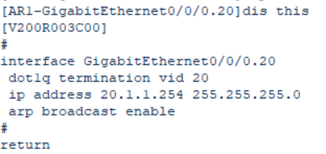 使子接口能接受带指定VLAN标签的帧,并剥离标签进行三层处理;使子接口能发送数据时,自动添加指定的VLAN标签。 - 开启子接口的广播处理功能(不开启的话,会丢弃广播包),pc1会发送ARP广播包,请求网关的mac地址,子接口必须能接受并处理广播包:
