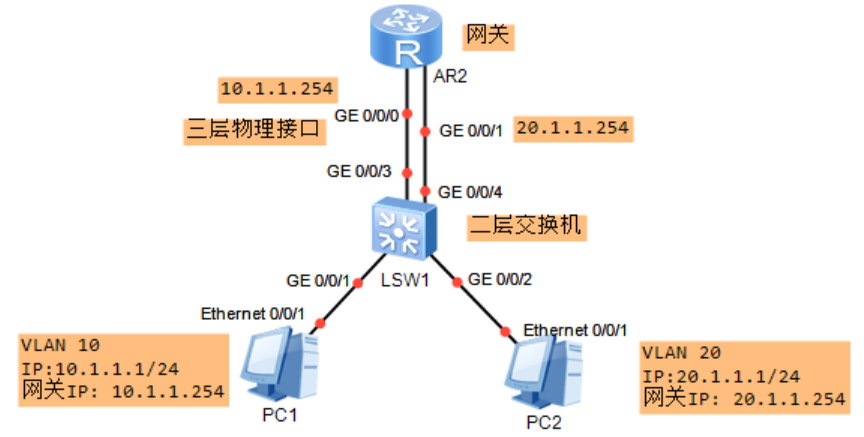 - 连接终端的接口类型需配置为access类型;g0/0/2-access接口-VLAN10;g0/0/3-access接口-VLAN20