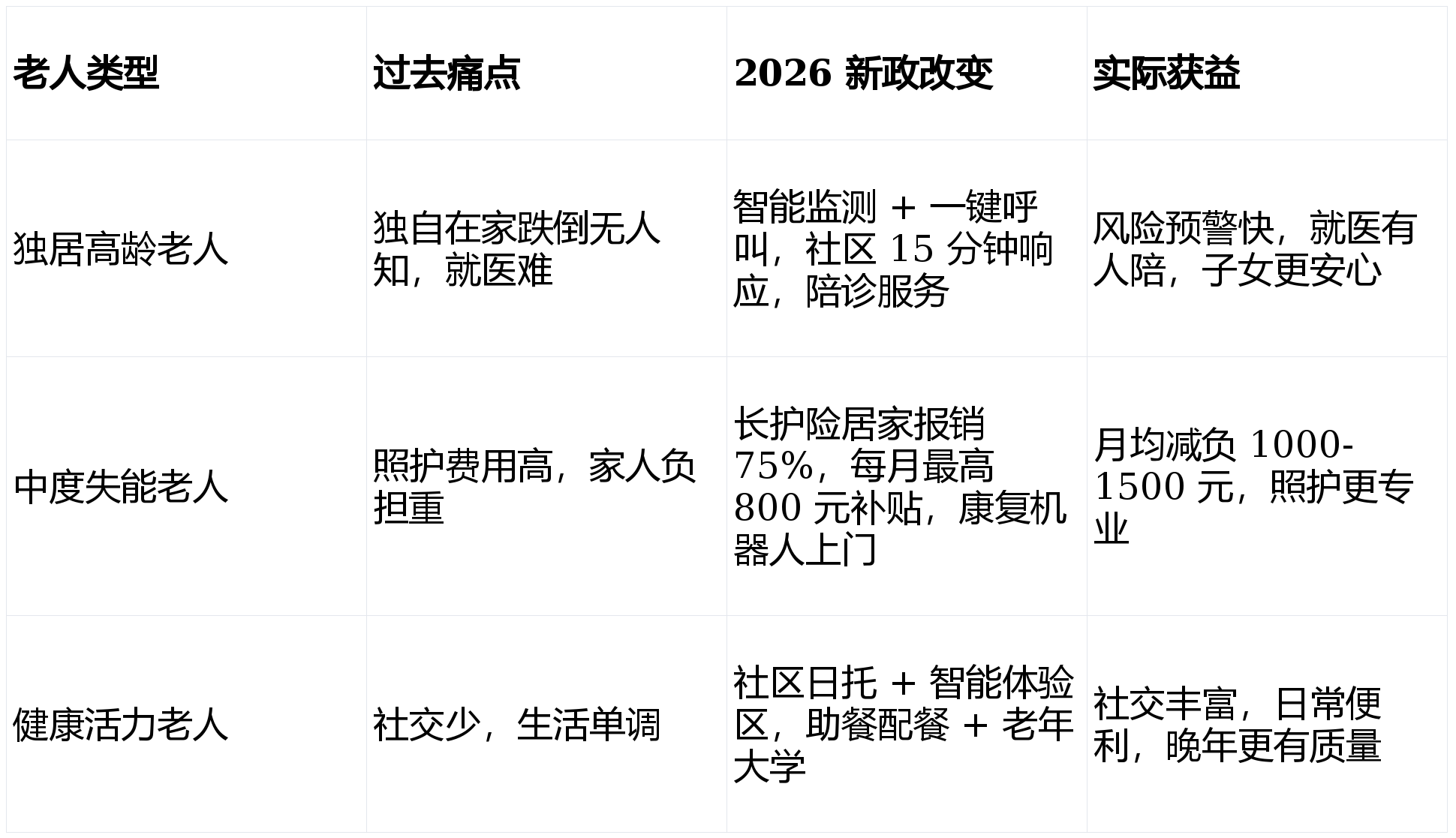 - 消费生态优化:适老化产品纳入医保支付,引导银发消费升级,让老人享受更多高品质服务。
